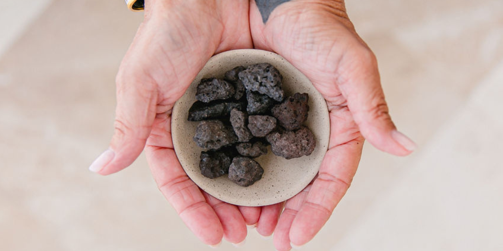 La bolsa que contiene la piedra de lava ha sido confeccionada por las mujeres de la Asociación Oncológica San Bassiano, una organización sin ánimo de lucro que protege y apoya a las personas con cáncer y a sus familias. Las mujeres que forman parte de ella expresan esta energía femenina en su esencia más auténtica.